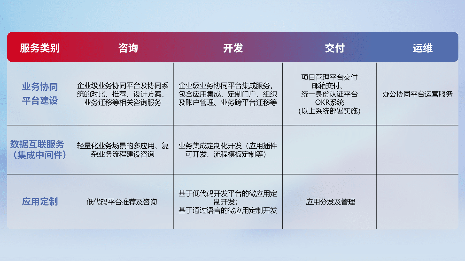 针对钉钉、、、企微、、、、IDaas等平台级产品提供产品的规划、、、、方案、、、交付、、定制化开发等服务,,,,实现如统一协同办公、、智能客户服务、、、、混合会议管理、、、智能数据查询、、、、等业务场景,,实现数字化转型。。