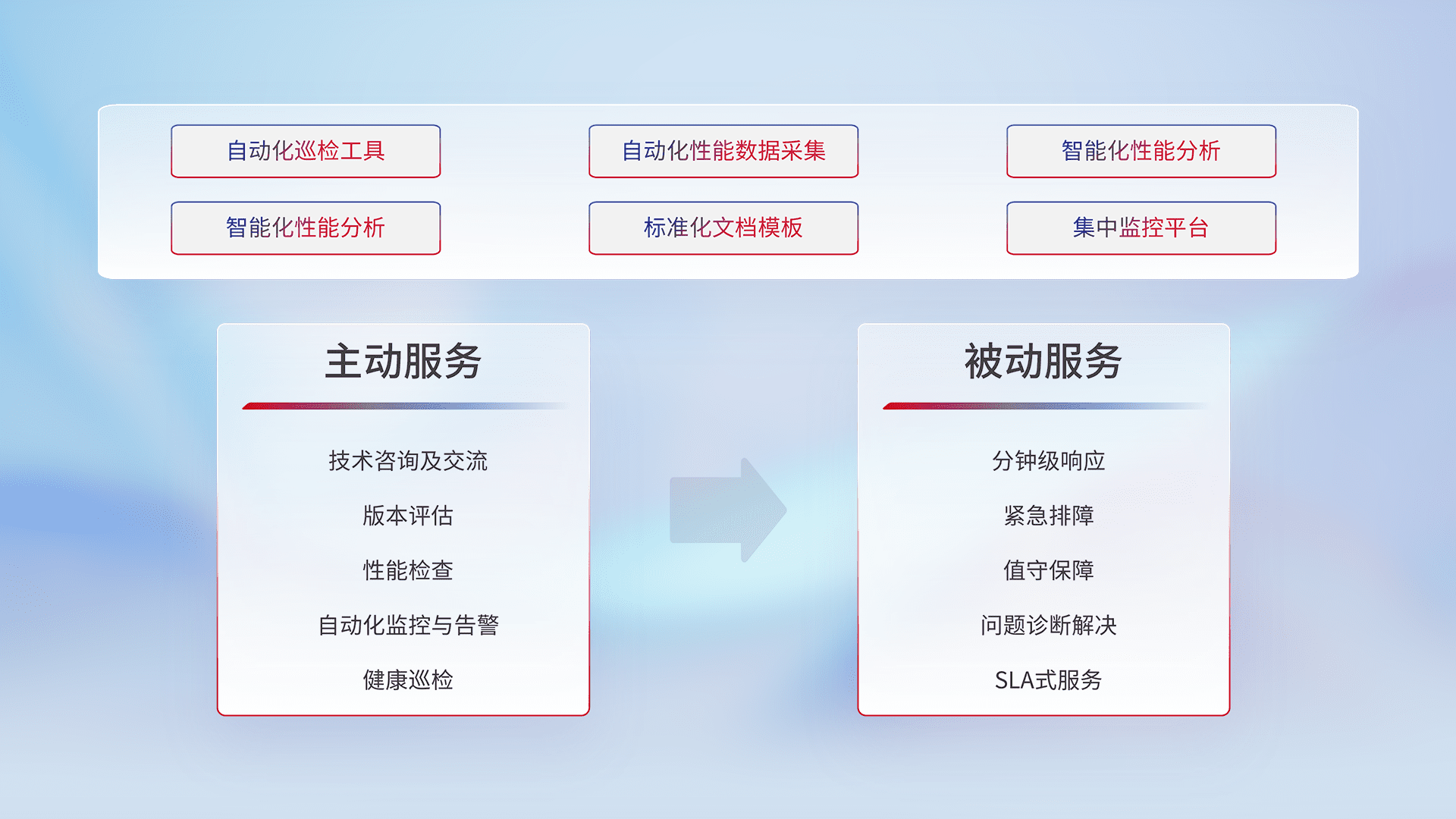 智能化工具和标准化文档,,,保障服务质量,,提供主动服务(包含技术咨询、、版本评估、、、、性能检查、、、自动化监控与告警、、健康巡检)和被动服务包含(分钟级响应、、、紧急排障、、值守保障、、、、问题诊断解决、、、SLA服务)。。。